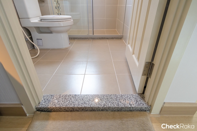เข้ามาดูที่ห้องน้ำกันต่อค่ะ ธรณีกั้นห้องน้ำจะเป็นหินอ่อน ส่วนพื้นในห้องน้ำเป็นพื้นกระเบื้อง