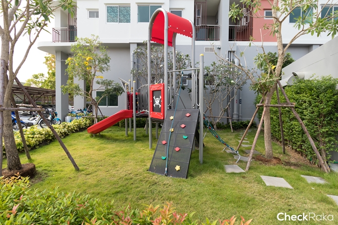สนามเด็กเล่นอยู่บริเวณด้านหลังสระว่ายน้ำ