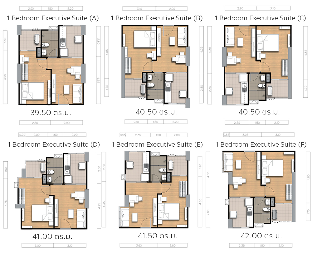 | Executive Suite (A) (B) (C) (D) (E) (F) 1 Bedroom | 39.5 - 42.0 | 1.92 - 2.62 | เฟอร์นิเจอร์ + 90,000 บาท | 190,000 บาท |