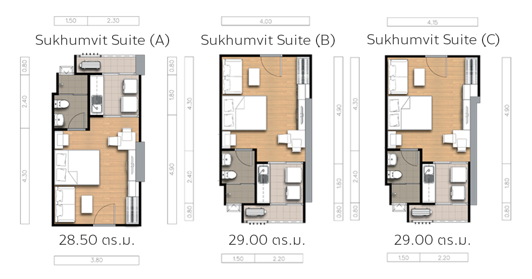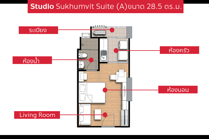 ห้องตัวอย่างห้องแรกเป็นห้องแบบ Studio Sukhumvit Suite (A) ขนาด 28.5 ตร.ม.