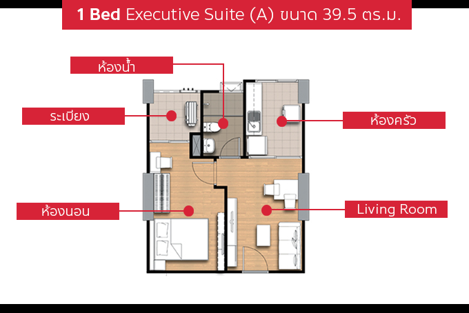 ห้องตัวอย่างห้องที่ 2 เป็นห้อง 1 Bedroom Executive Suite (A) ขนาด 39.5 ตร.ม.