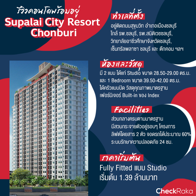 โครงการ ศุภาลัย ซิตี้ รีสอร์ท ชลบุรี (Supalai City Resort Chonburi) ตั้งอยู่บนพื้นที่ 6-0-30.1 ไร่ เป็นคอนโด High-Rise ความสูง 25 ชั้น รวมดาดฟ้า 1 อาคาร การออกแบบอาคารโดยได้แรงบันดาลใจมาจากปะการังแดง นำมาใช้เป็นองค์ประกอบของการออกแบบอาคารทั้งภายในและภายนอก มียูนิตทั้งหมด 590 ยูนิต แบ่งเป็นห้องพักอาศัย 586 ยูนิต และร้านค้า 4 ยูนิต