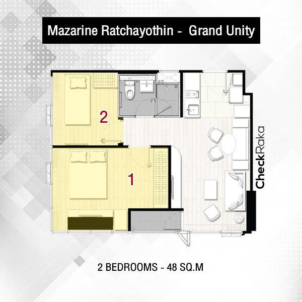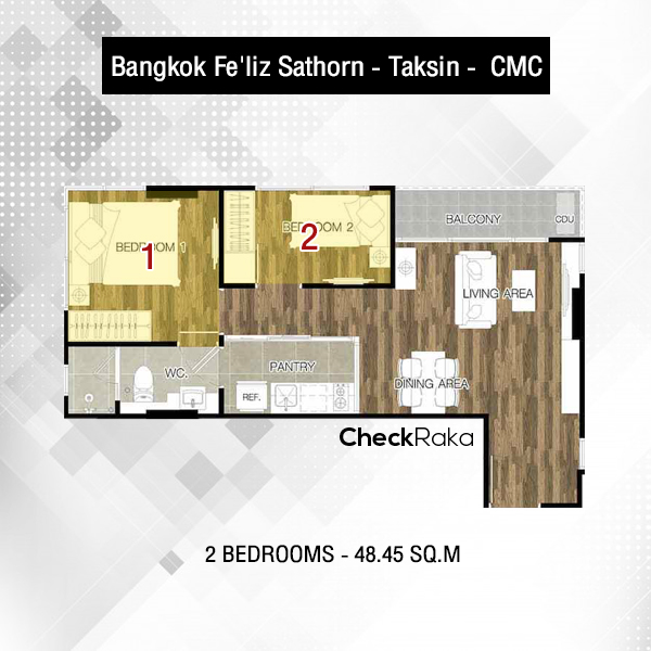 แบบห้อง แบงค์คอก เฟ'ลิซ สาทร-ตากสิน ขนาด 48.45 ตร.ม. ห้องนี้จะเป็นห้องมุม ก็เลยจะมีพื้นที่ตรงประตูทางเข้า-ออกหลักอยู่พอสมควรเลย สามารถ Built-in ตู้เก็บรองเท้ารวมถึงชั้นวางของตรงนี้ได้ค่ะ เข้ามาในส่วนของห้องนอนที่วางตัวอยู่ด้านในสุดของห้อง ได้ความเป็นส่วนตัวและดูเป็นสัดส่วนมากๆ ห้องน้ำมี 1 ห้องจะอยู่ใน Master Bedroom สำหรับห้องนอนห้องที่ 2 และแขกก็จะเข้าห้องน้ำได้อีกทางโดยผ่านครัว