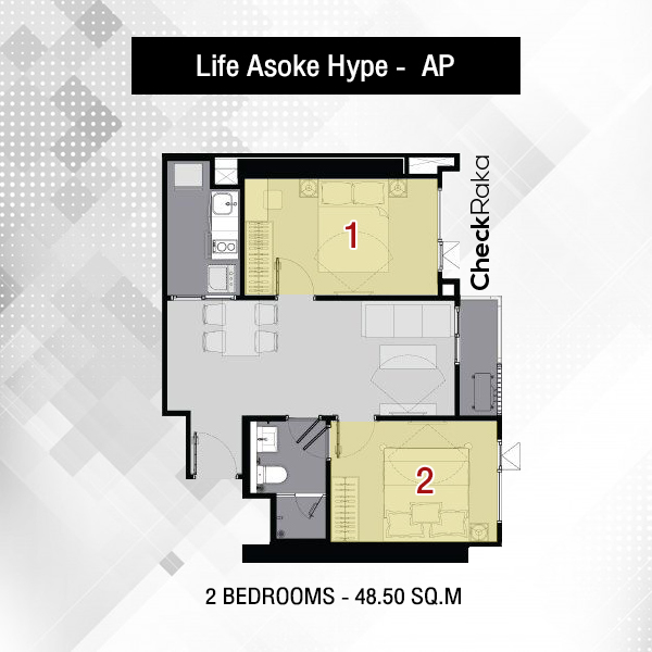 ไลฟ์ อโศก ไฮป์ จาก AP ห้องนอนทั้ง 2 ห้องมีขนาดเท่าๆ กันค่ะ โดยมีโซน Living กั้นอยู่ตรงกลางโดยระเบียงจะอยู่ในส่วนนี้ ห้องน้ำก็จะมีห้องเดียวค่ะ ใช้ร่วมกันแต่จะสามารถเข้าได้ 2 ทาง คือจากด้านนอกและทางห้องนอนที่ 2 ส่วนครัวจะเป็นครัวปิดเป็นสัดส่วน และอยู่ด้านในของห้อง ใครที่ไม่ชอบเปิดมาปุ๊บแล้วเจอครัวเลยน่าจะถูกใจ