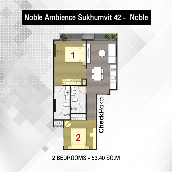 แบบห้องของ โนเบิล แอมเบียนส์ สุขุมวิท 42 จากโนเบิล อาจดูแปลกตานิดหน่อย เพราะเป็นห้องมุมพอดี ห้องที่ได้เลยจะเป็นแนวยาวๆ หน่อยค่ะ แต่จุดเด่นคือ ได้ 2 ห้องน้ำ ส่วนแรกจะเป็นครัวและพื้นที่นั่งเล่นพร้อมระเบียงสไตล์โนเบิล ห้องนอนทั้ง 2 ห้องจะถูกกั้นด้วยห้องน้ำ โดย Master bedroom จะมีห้องน้ำส่วนตัว ส่วนห้องนอนที่ 2 ก็จะใช้ห้องน้ำรวมกับด้านนอก ภายในห้องออกแบบให้ตู้เสื้อผ้าอยู่ลึกเข้าไป ทำให้ห้องอยู่แนวระนาบเดียวกัน ห้องจึงโล่งมากขึ้น