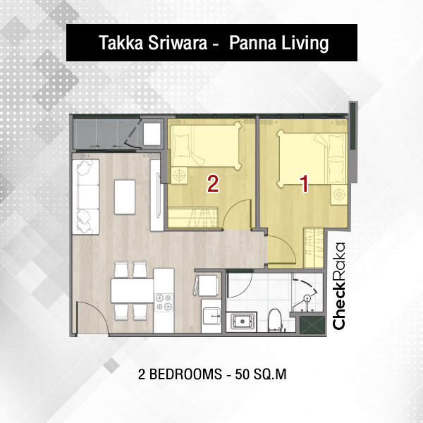 โครงการตรรกะ ศรีวรา ของพันนา ลิฟวิ่ง ออกแบบ 2 ห้องนอน ขนาด 50 ตร.ม. มาได้ค่อนข้างลงตัว ครัวที่ได้จะเป็นครัวเปิด พื้นที่นั่งเล่นและรับประทานอาหารค่อนข้างกว้าง แต่ห้องน้ำมีเพียงห้องเดียวตั้งอยู่นอกห้องนอนทั้ง 2 ห้อง ก็ถือว่าแฟร์ๆ เป็นห้องน้ำรวมทั้งผู้อยู่อาศัยและแขกที่มาค่ะ ขนาดของห้องนอน Master จะใหญ่ว่าอีกห้องเล็กน้อย โดยเพิ่มมาในส่วนของพื้นที่แต่งตัว สำหรับแบบนี้จะไม่มีระเบียงทั้งคู่ค่ะ