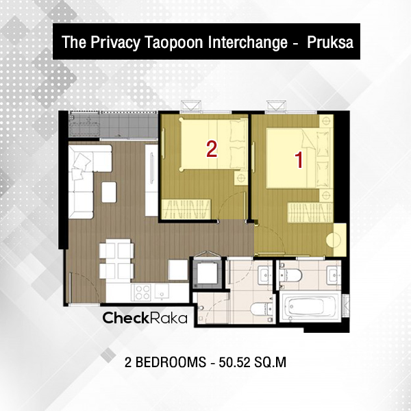 เดอะ ไพรเวซี่ เตาปูน-อินเตอร์เชนจ์ จากค่ายพฤกษาก็มีแบบห้อง 2 ห้องนอนขนาดเล็กเหมือนกันค่ะ ขนาดอยู่ที่ 50.52 ตร.ม. ครัวที่ได้จะเป็นครัวเปิด เชื่อมต่อไปยังพื้นที่นั่งเล่นและไปสุดที่ระบียงค่ะ Master bedroom ขนาดกว้างขวางมีห้องน้ำส่วนตัวพร้อมอ่างอาบน้ำ ส่วนห้องน้ำอีกห้องก็อยู่ตรงข้ามกับห้องนอนห้องที่ 2 พอดี และมีตู้สำหรับใส่เครื่องซักผ้าภายในห้องให้ด้วย คนที่ไม่ชอบเอาเครื่องซักผ้าไปวางที่ระเบียงต้องถูกใจ