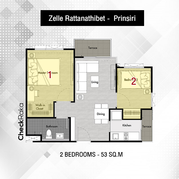 เซล รัตนาธิเบศร์ จากปริญสิริ ขนาด 53 ตร.ม. รู้สึกว่าค่อนข้างเป็นสัดส่วนตรงที่เปิดเข้ามาเป็นพื้นที่โล่งๆ ก่อน ขวามือเป็นห้องครัวติดกันก็เป็นพื้นที่รับประทานอาหาร ถัดไปจะเป็นห้องนั่งเล่น/รับแขก โดยระเบียงจะอยู่ในส่วนนี้และมีอีกที่คือที่ครัวค่ะ ห้องนอนทั้ง 2 ห้องจะตั้งอยู่ตรงข้ามกัน ห้องน้ำจะใกล้กับ Master Bedroom มากกว่า ห้องนอนที่ 2 ก็อาจจะเดินไกลกว่านิดหน่อย ห้องนอนทั้ง 2 ห้องออกแบบให้มีพื้นที่ตั้งตู้เสื้อผ้าได้พอดี ทำให้ไม่เกะกะและมีพื้นที่เหลือวางอย่างอื่นได้ด้วย