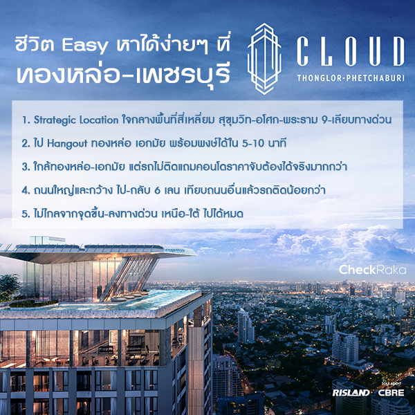 ทองหล่อ ยังคงเป็นทำเลยอดนิยมในการลงทุนอสังหาริมทรัพย์ใจกลางกรุงเทพฯ ที่เติบโตอย่างต่อเนื่อง นอกจากจะมี Demand มากขึ้นเรื่อยๆ ทั้งชาวไทยและชาวต่างชาติ (โดยเฉพาะชาวญี่ปุ่น) แล้ว สิ่งที่ทำให้ย่านนี้มีเสน่ห์และน่าอยู่ก็คือสภาพแวดล้อมตลอดทั้งเส้นทองหล่อและบริเวณใกล้เคียง มีทั้งไลฟ์สไตล์แบบ Premium และแบบ Simple ปะปนกันไป และยังอยู่ไม่ไกลจาก CBD ที่เป็นแหล่งอาคารสำนักงาน ส่งผลให้ทำเลใกล้เคียงอย่างเพชรบุรีดูโดดเด่นและมาแรงในปี 2019 นี้ ซึ่งหลายโครงการได้เล็งเห็นความฮอตของโลเคชั่น 1 ในนั้นคือโครงการของ Risland ชื่อว่า คลาวด์ ทองหล่อ-เพชรบุรี (CLOUD Thonglor-Phetchaburi) เป็นโครงการที่อยู่ติดถนนเพชรบุรีสามารถใช้ไลฟ์ไตล์ทองหล่อได้ และบวกความพิเศษในเรื่องของความสงบ คนไม่พลุกพล่าน ติดถนนใหญ่ ใกล้ทางด่วน ทำให้ใช้ชีวิตง่ายขึ้น