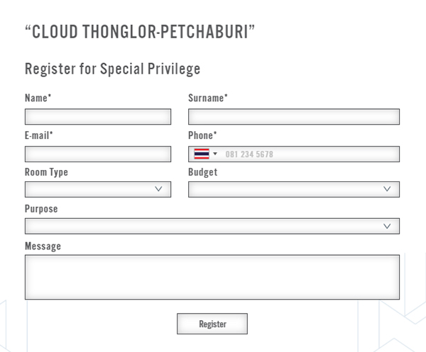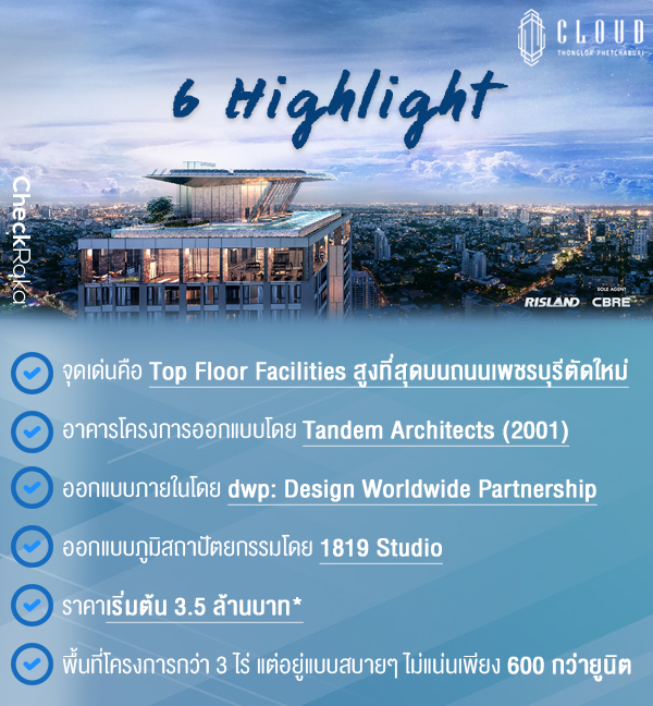 Risland ตั้งใจที่จะพัฒนาโครงการ CLOUD Thonglor-Phetchaburi ให้เป็นโครงการแบบ Luxury Premium เป็นที่อยู่อาศัยที่อยู่สบายและเป็นส่วนตัว จึงได้นำแรงบันดาลใจจากท้องฟ้า Feel The Cloud มาเป็น Concept โครงการ โดดเด่นด้วย Triple Facilities ที่กระจายตัวอยู่ภายในอาคารและชั้นบนสุดบนความสูง 55 ชั้น นับว่าเป็นคอนโดที่มี Top Floor Facility สูงที่สุดบนถนนเพชรบุรี โดยตัวอาคารภายนอกเป็นสไตล์โมเดิร์น ตัดกับภายในที่ตกแต่งสง่า สบายตา และสงบเงียบที่เป็นเอกลักษณ์อันโดดเด่นของ คลาวด์ ทองหล่อ-เพชรบุรี (CLOUD Thonglor-Phetchaburi) ราคาเริ่มต้น 3.5 ล้านบาท* ท่านที่สนใจโครงการสามารถลงทะเบียนเพื่อรับสิทธิพิเศษได้ที่ลิงก์ด้านล่างนี้ค่ะ