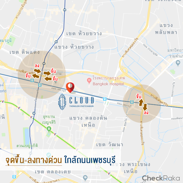 โครงการ คลาวด์ ทองหล่อ-เพชรบุรี (CLOUD Thonglor-Phetchaburi) อยู่บนถนนเพชรบุรี ใกล้จุดขึ้น-ลงทางด่วนหลายจุด โดยเฉพาะช่วงด่านอโศกและอีกทางคือ ด่านพัฒนาการ ตรงจุดนี้ลงมาจากทางด่วนแล้วเลี้ยวขวายาวๆ ก็เข้าสู่ถนนเพชรบุรีเลยค่ะ
