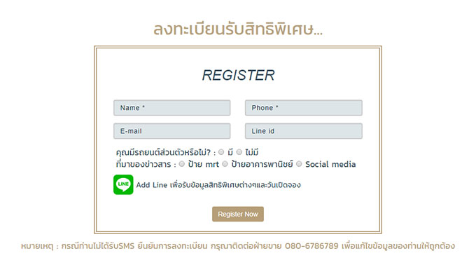 ผู้ที่สนใจสามารถลงทะเบียนรับสิทธิพิเศษหรือข้อมูลเพิ่มเติมได้ด้านล่าง และสามารถเข้าชมห้องตัวอย่างได้ที่สำนักงานขายโครงการทุกวัน ตั้งแต่เวลา 09.30-18.30 น.