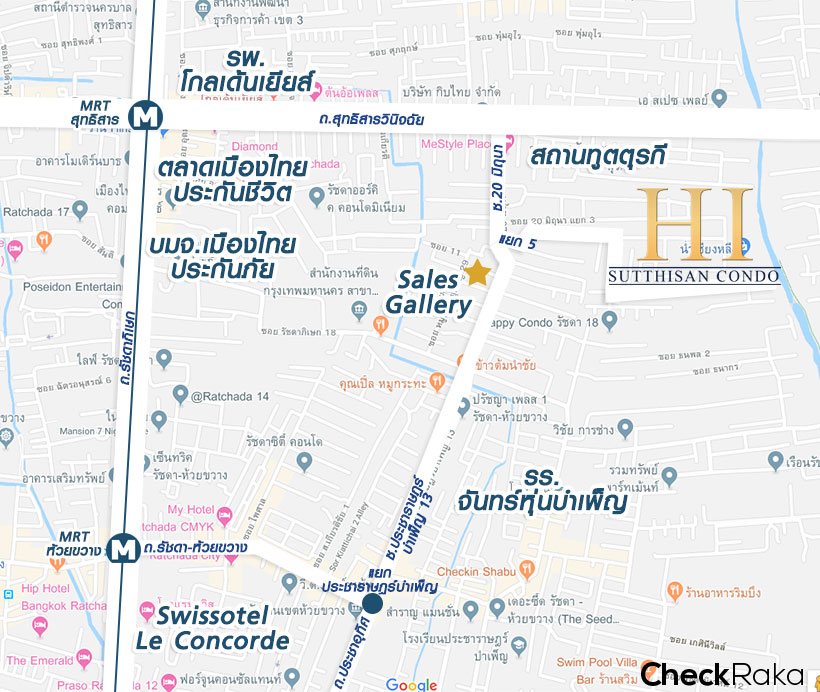 ไฮ สุทธิสาร คอนโด (HI Sutthisan Condo) ตั้งอยู่ภายในซอย 20 มิถุนา แยก 5 ห่างจากปากซอยประมาณ 500 ม. และไม่ไกลจากสถานีรถไฟฟ้า MRT สุทธิสาร