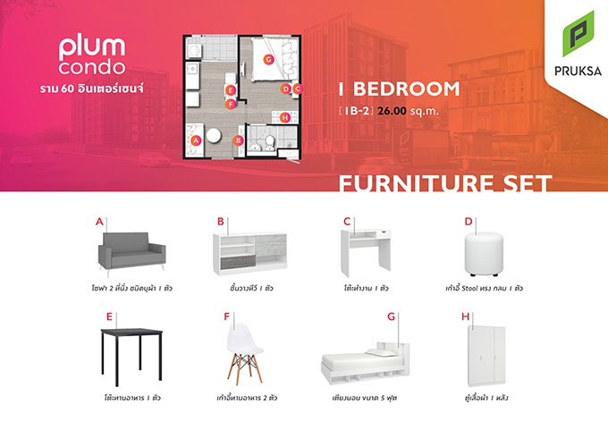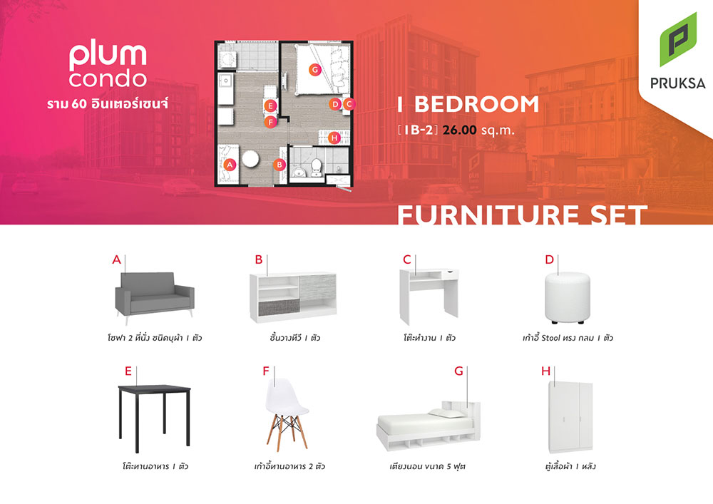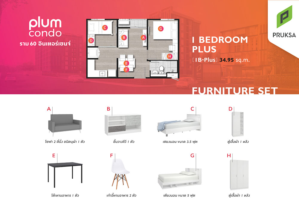 ปัจจุบัน พลัม คอนโด ราม 60 อินเตอร์เชนจ์ (Plum Condo Ram 60 Interchange) สร้างเสร็จพร้อมอยู่ค่ะ โดยการขายจะแบ่งออกเป็น 2 แบบด้วยกันคือ Fully Furnished ในอาคาร A,B,C,D,E,F และแบบ Fully Fitted ในอาคาร G และ H โดยจะได้เฟอร์นิเจอร์ตามนี้ค่ะ