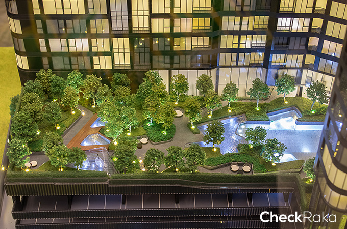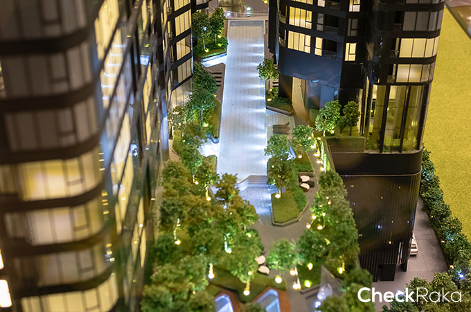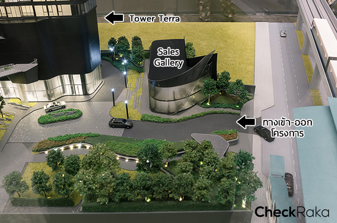 เข้ามาจะเจอกับสวนสีเขียวกระจัดกระจายทั่วโครงการ ตึกด้านหน้าสุดคือ อาคาร Terra ที่เปิดขายก่อนนี่เองค่ะ