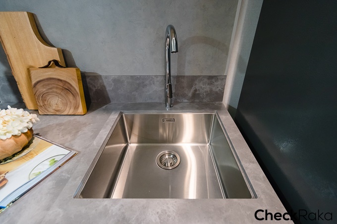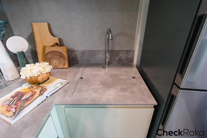 วัสดุผิวปิดท็อปครัวเป็นหินสังเคราะห์โทนสีเทา พร้อมพื้นที่เตรียมอาหาร