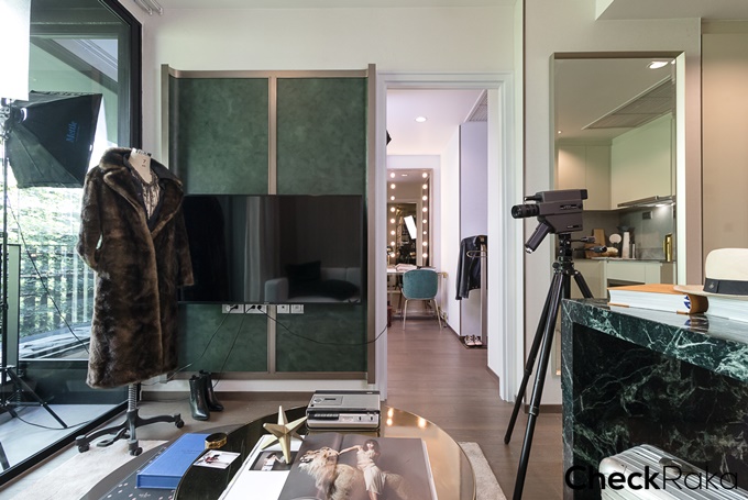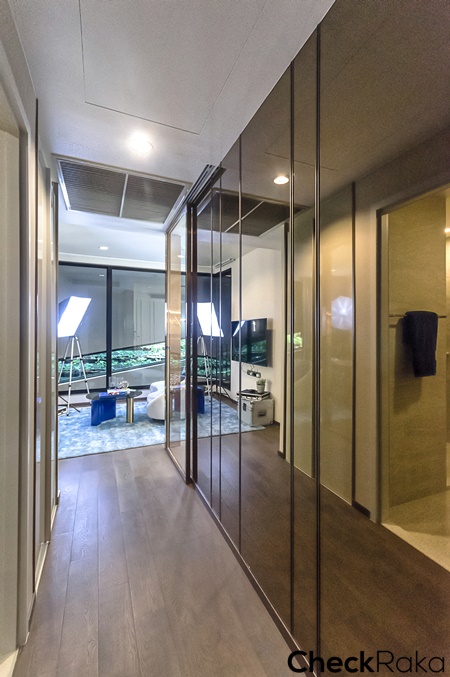 ทางโครงการติดกระจกมาให้ดูเป็นไอเดียทำให้โถงทางเดินที่จะเชื่อมต่อไปห้องนั่งเล่นดูกว้างยิ่งขึ้น