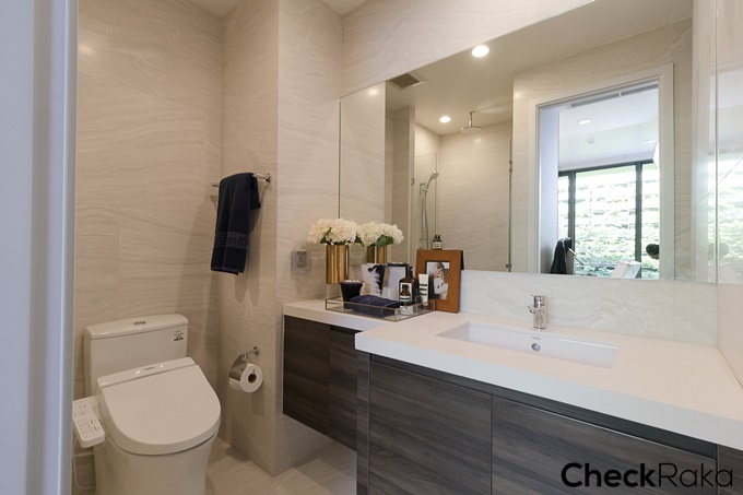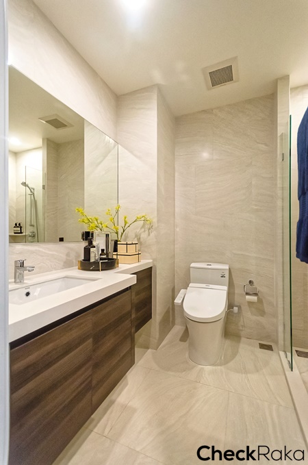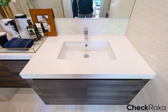 ยังคงได้ห้องน้ำขนาดใหญ่ กั้นแบ่งพื้นที่ใช้งานเป็นสัดส่วน ได้กระจกเงาบานใหญ่ และท๊อปอ่างล่างหน้า