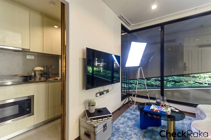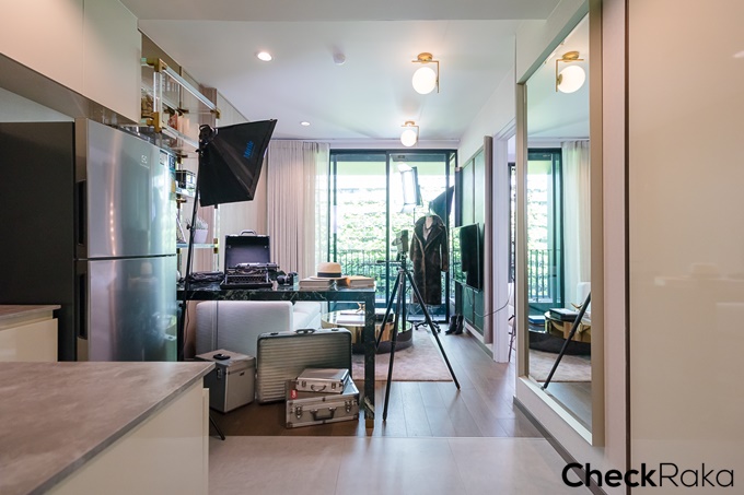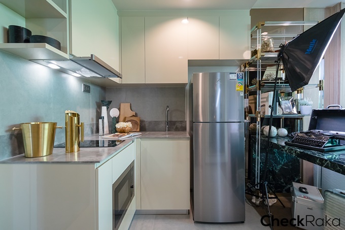 เข้ามาจะเจอกับโซนห้องครัวอยู่ทางซ้าย เป็นแบบครัวเปิดได้ชุดครัว Built-in รูปตัว L ตามแบบห้องตัวอย่าง