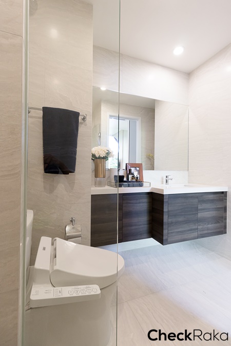 ผนังและพื้นห้องน้ำกรุด้วยกระเบื้องแกรนิตโต้ลายหินอ่อนแผ่นใหญ่ ทำความสะอาดง่าย