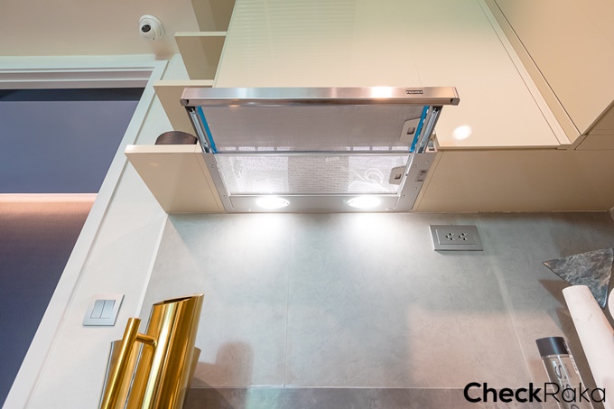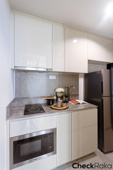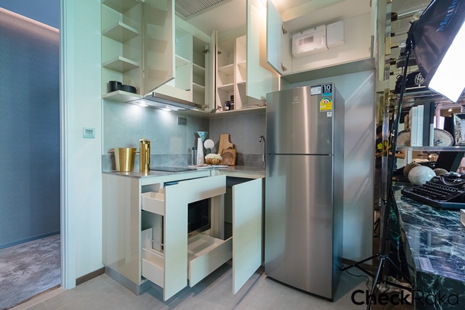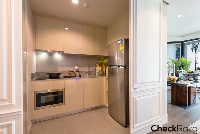 ห้องครัวจะอยู่ตรงข้ามกับห้องน้ำ มีประตูบานเลื่อนกั้นเป็นสัดส่วน ได้ชุดเคาน์เตอร์ครัวรูปตัว L