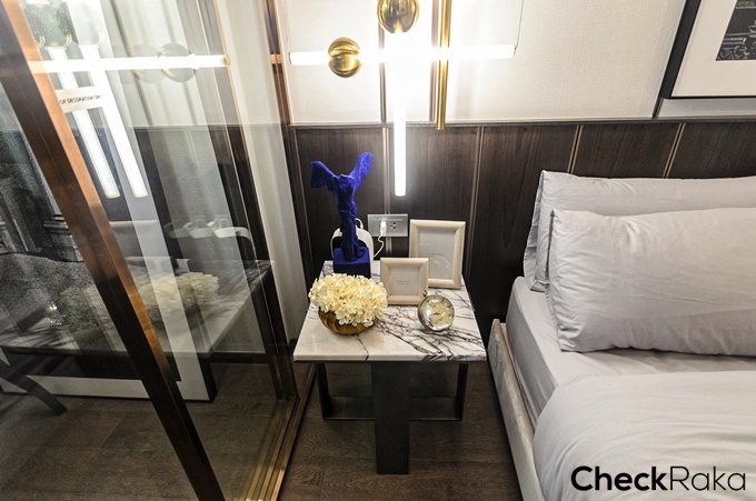 แต่ด้านข้างเตียงยังเหลือพื้นที่พอให้วางโต๊ะข้างเตียงได้สบายๆ