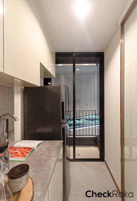 ห้องครัวจะเชื่อมต่อกับส่วนของระเบียง เปิดประตูระเบียงเพื่อช่วยระบายกลิ่นเวลาทำอาหารได้ดี