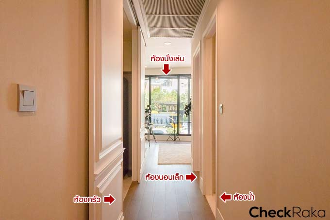 เข้ามาทางซ้ายจะเป็นห้องน้ำที่ 2 ห้องนอนที่ 2 ห้องครัว และห้องนั่งเล่น ส่วนทางขวาเป็นห้อง Master bedroom