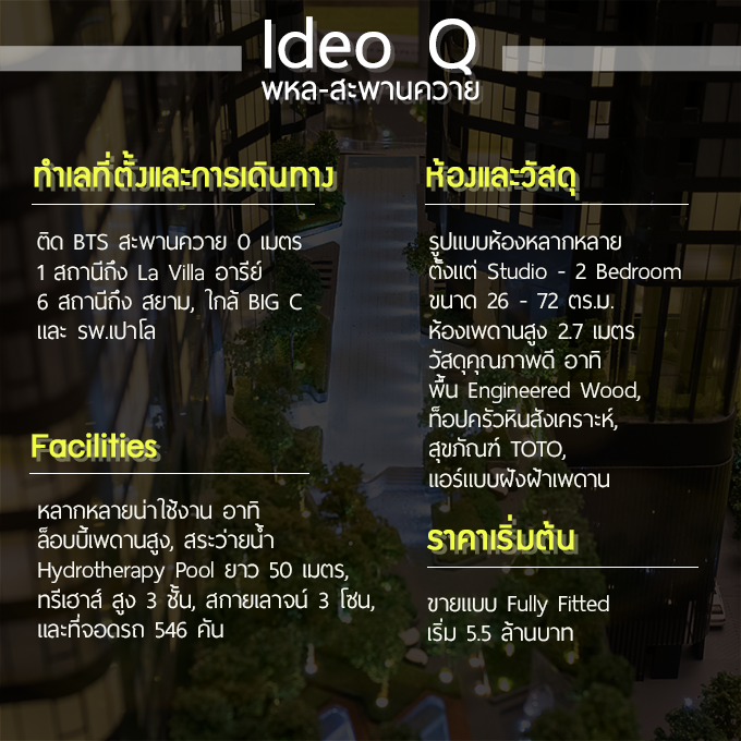 รีวิว-เยี่ยมชมคอนโดวันนี้ พบกับโครงการ "ไอดีโอ คิว พหล-สะพานควาย (Ideo Q Phahol-Saphankwai)" คอนโด High Rise จากอนันดาฯ มีจุดเด่นในเรื่องของทำเลที่ตั้งที่ติดถนนใหญ่พหลโยธิน และที่สำคัญอยู่ติดทางขึ้น-ลงบันไดรถไฟฟ้า BTS สถานีสะพานควาย เพียง 0 เมตร! เดินทางก็สะดวก อยู่ก็สบาย และสิ่งอำนวยความสะดวกครบครัน ในราคาเริ่มต้นที่ 5.5 ล้านบาท พร้อมทั้งยังมีความน่าสนใจ และรายละเอียดอื่นๆ ให้ชมอีกมากมาย ตามไปดูกันเลยค่ะ