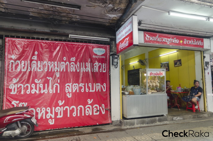 เลยไปหน่อยก็มีร้านก๋วยเตี๋ยวหมูตำลึง ข้าวมันไก่ โจ๊กหมู ป้ายแดงสดใส