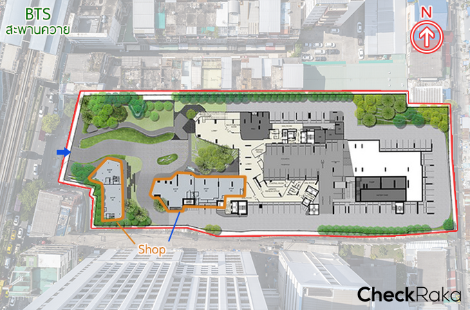 ยูนิตที่เป็นร้านค้า 5 ยูนิตจะอยู่ชั้นล่าง ด้านหน้าโครงการ