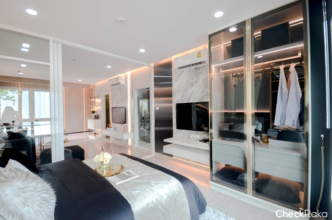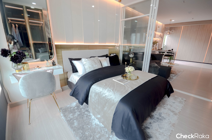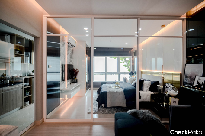 ห้องนอนจะอยู่ติดกับโซน Living กั้นด้วยประตูกระจกบานสไลด์ 3 ตอน