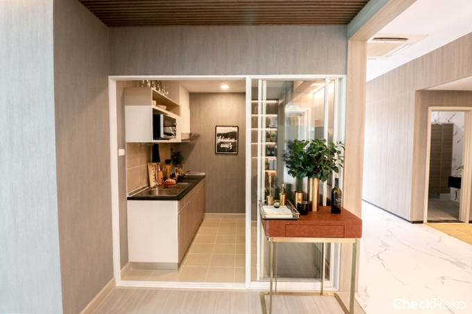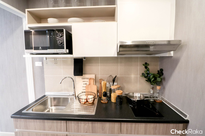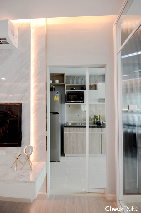 มาดูครัวกันต่อค่ะ ครัวของห้องนี้จะเป็นครัวปิด กั้นด้วยประตูกระจกบานสไลด์