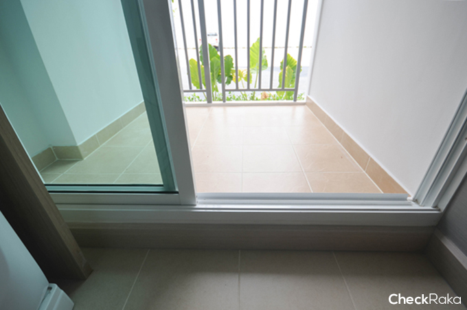 ก่อนออกระเบียงจะมีธรณีป้องกันน้ำและฝุ่นเข้ามาภายในห้อง