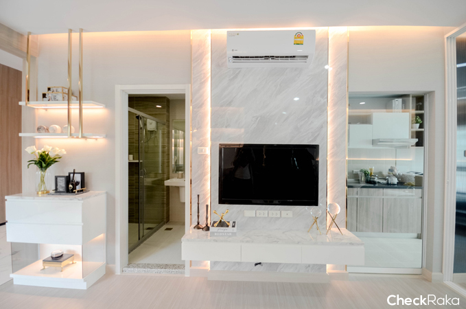 ฝั่งตรงข้ามจะเป็นจุดติดตั้งทีวี ซ้ายมือเป็นประตูเข้าห้องน้ำ และขวามือเป็นประตูครัวค่ะ