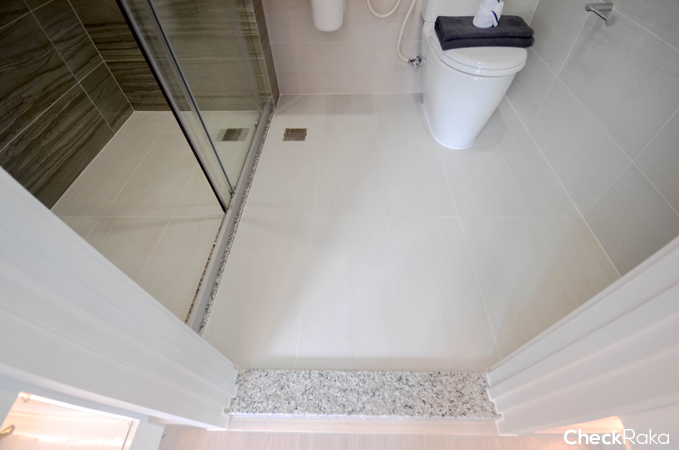 พื้นของห้องจากเดิมเป็นลามิเนตเข้ามาในห้องน้ำจะเป็นพื้นกระเบื้องค่ะ มีธรณีหินอ่อนป้องกันน้ำออกจากห้องน้ำ