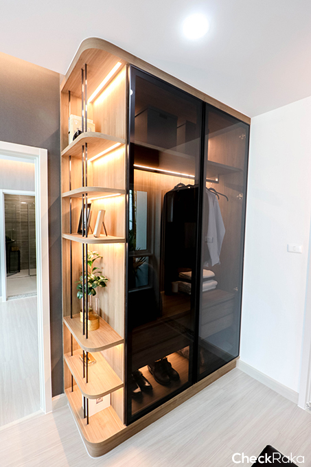 อีกฝั่งของเตียงก็เป็นที่วางตู้เสื้อผ้า ห้องนี้นำเอากระจกมาเป็นวอลเปเปอร์ช่วยให้ห้องกว้างและดูไม่ทึบ