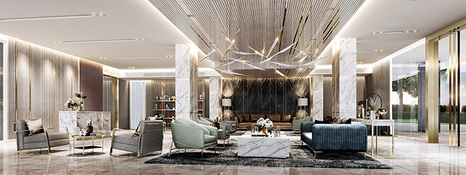 Lobby ตกแต่งด้วยหินอ่อนหรูหรา พร้อมที่นั่งรองรับแขกผู้มาเยี่ยม