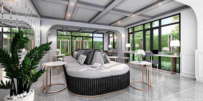 ตรงนี้พื้นที่ค่อนข้างลึกดังนั้นจะสามารถวางโซฟาแบบยาวขนาด 4-5 ที่ได้ ส่วนโต๊ะรับประทานอาหารก็ปรับให้เหมาะกับ