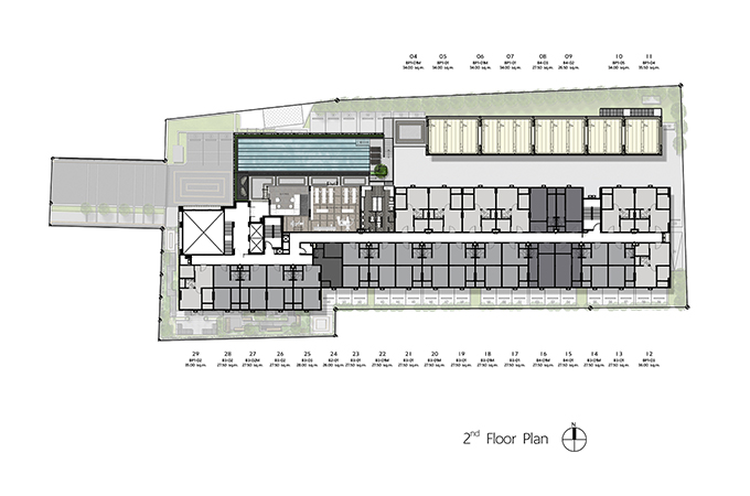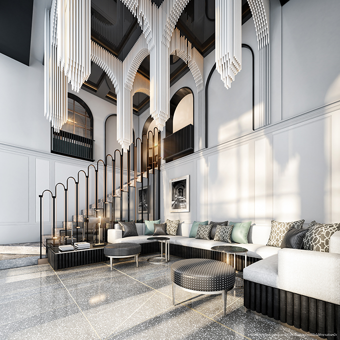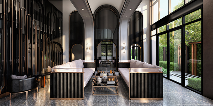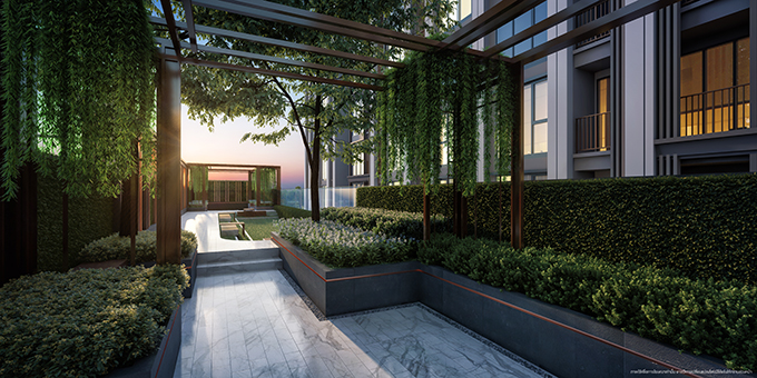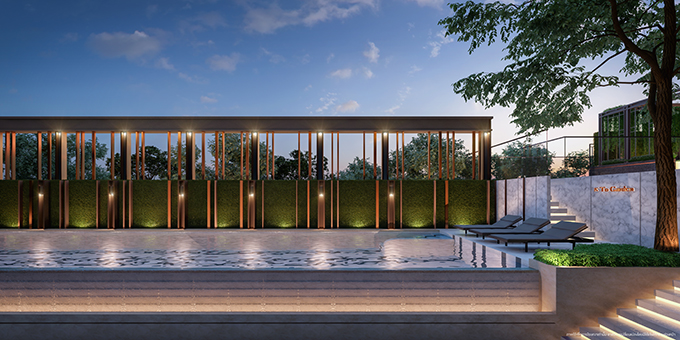 ส่วนกลางของโครงการ THE ORIGIN Ratchada-Ladprao โดยการออกแบบได้นำแรงบันดาลใจในการออกแบบรูปลักษณ์ของสถาปัตยกรรมแบบ Classic Heritage มาใช้ทั้งรูปแบบสัดส่วน วัสดุ และสี ใช้เสน่ห์จากวัสดุสีโทนน้ำตาลและขาวครีม ตัดกับเส้นอะลูมิเนียมสี Antique Copper เพิ่มความหรูหราให้กับงานสถาปัตยกรรมสไตล์นี้ เน้นส่วนพื้นที่พิเศษบริเวณสระว่ายน้ำที่รับสายตาจากทางเข้าโครงการด้วยระแนงเส้นตั้งของอะลูมิเนียมสี Antique Copper และแนวพุ่มไม้ ดูสง่างาม และน่าค้นหา สะท้อนรสนิยมที่มีเอกลักษณ์ของผู้อยู่อาศัย