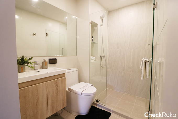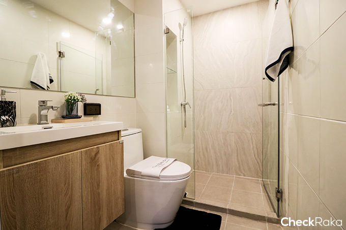 ห้องน้ำมีให้ครบทั้งอ่างล้างหน้าพร้อมตู้เก็บของ โถสุขภัณฑ์ สายฉีดชำระ กระจกบานใหญ่ Shower box ฝักบัว