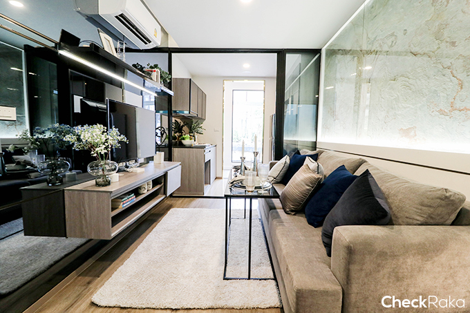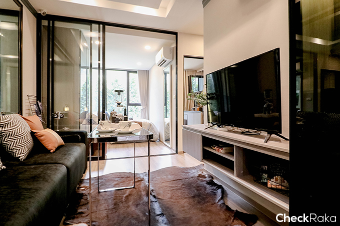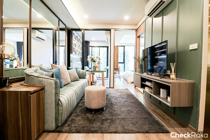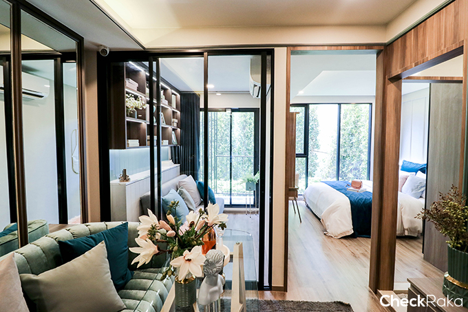 เลื่อนประตูบานเลื่อนกระจกออกก็จะพบกับ โซน Living และกวาดสายตาลึกเข้าไปจะเป็นเตียงนอน