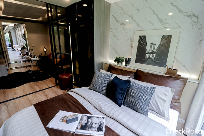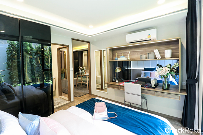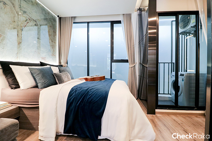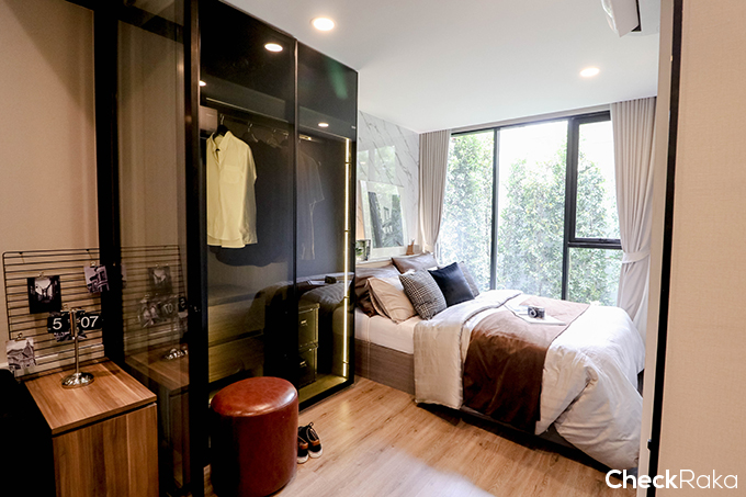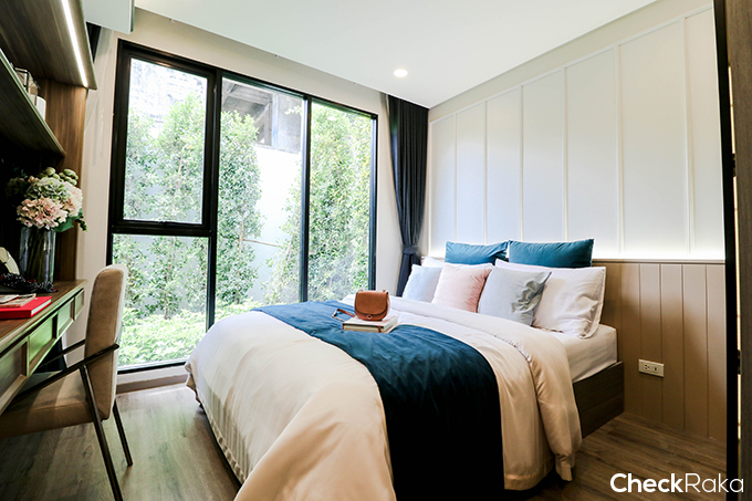 พื้นที่ถัดไปเป็นพื้นที่วางเตียงนอน โครงการให้ฐานเตียงขนาด 5 ฟุตมาด้วย