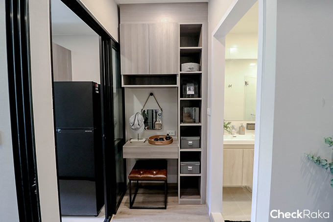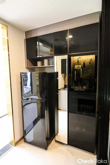 ฝั่งตรงข้ามจะเป็นพื้นที่วางตู้เย็นและ Built-in ตู้เก็บของให้สำหรับวางรองเท้า กุญแจ ฯลฯ
