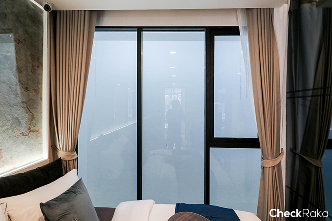 ห้องนอนกั้นด้วยประตูกระจกบานสไลด์ รับแสงและวิวด้วยกระจกบานใหญ่จรดฝ้า