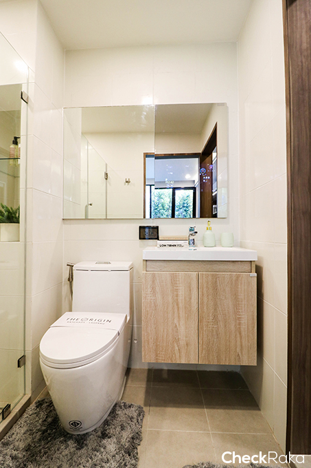 พื้นของห้องน้ำเป็นพื้นกระเบื้อง โถสุขภัณฑ์ของ Hafele