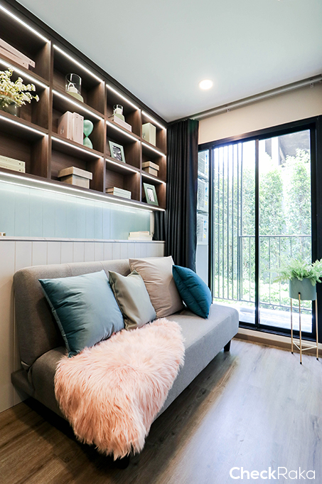 เปิดประตูเข้าห้องมาจะเจอโซน Living มีตู้เก็บของให้ทางขวามือ