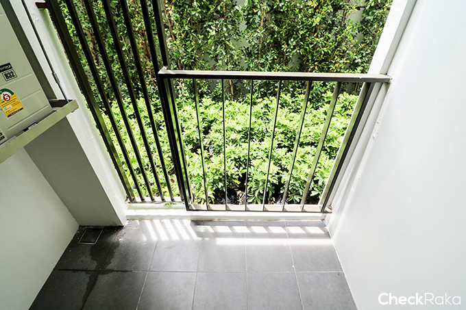 พื้นที่ระเบียงไม่ได้กว้างมากนัก เหมาะสำหรับวางต้นไม้ตกแต่งเล็กๆ หรือจะตากผ้าก็ได้ค่ะ