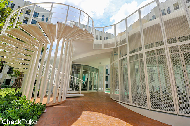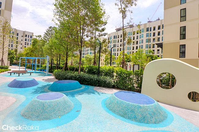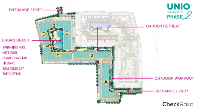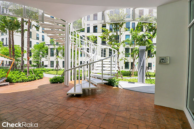 พื้นที่ส่วนกลางหลักๆ จะอยู่ระหว่างอาคาร C, D และ E ค่ะ ส่วนบริเวณตึก A และ B จะมีพื้นที่ลานกิจกรรม และสนามเด็กเล่น โอบล้อมด้วยพื้นที่สีเขียวทุกอาคาร ในส่วนของทางเข้า-ออก จะมี 2 ทางค่ะ ประตูหลักเลยคือ ด้านซอยสุขุมวิท 72 ค่ะ แต่มีประตูเล็กอีกหนึ่งประตูหลังโครงการ สามารถทะลุไปซอยสุขุมวิท 70/1 ได้