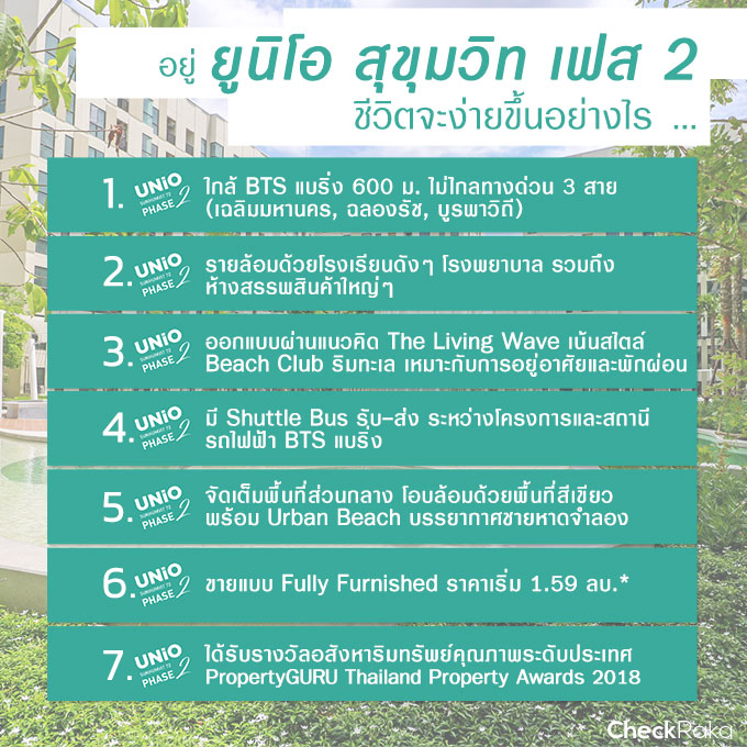 ยูนิโอ สุขุมวิท 72 เฟส 2 (Unio Sukhumvit 72 Phase 2) คอนโด Low Rise ราคาดีที่สุดในย่านบางนา สะดวกทุกการใช้ชีวิตบนเส้นสุขุมวิท เพียงไม่กี่นาทีถึงที่ทำงาน สุดพิเศษกับการตกแต่งสไตล์ Beach Club ในคอนเซ็ปต์ The Living Wave เพราะทุกพื้นที่คือการพักผ่อน และยังการันตีคุณภาพ ด้วยรางวัลใหญ่ระดับประเทศ PropertyGuru Thailand Property Awards 2018 ปัจจุบันโครงการสร้างเสร็จ พร้อมอยู่แล้วค่ะ โดยขายแบบ Fully Furnished ทั้งโครงการ พร้อมเปิด Grand Opening ในวันที่ 3 ส.ค. 62 นี้!